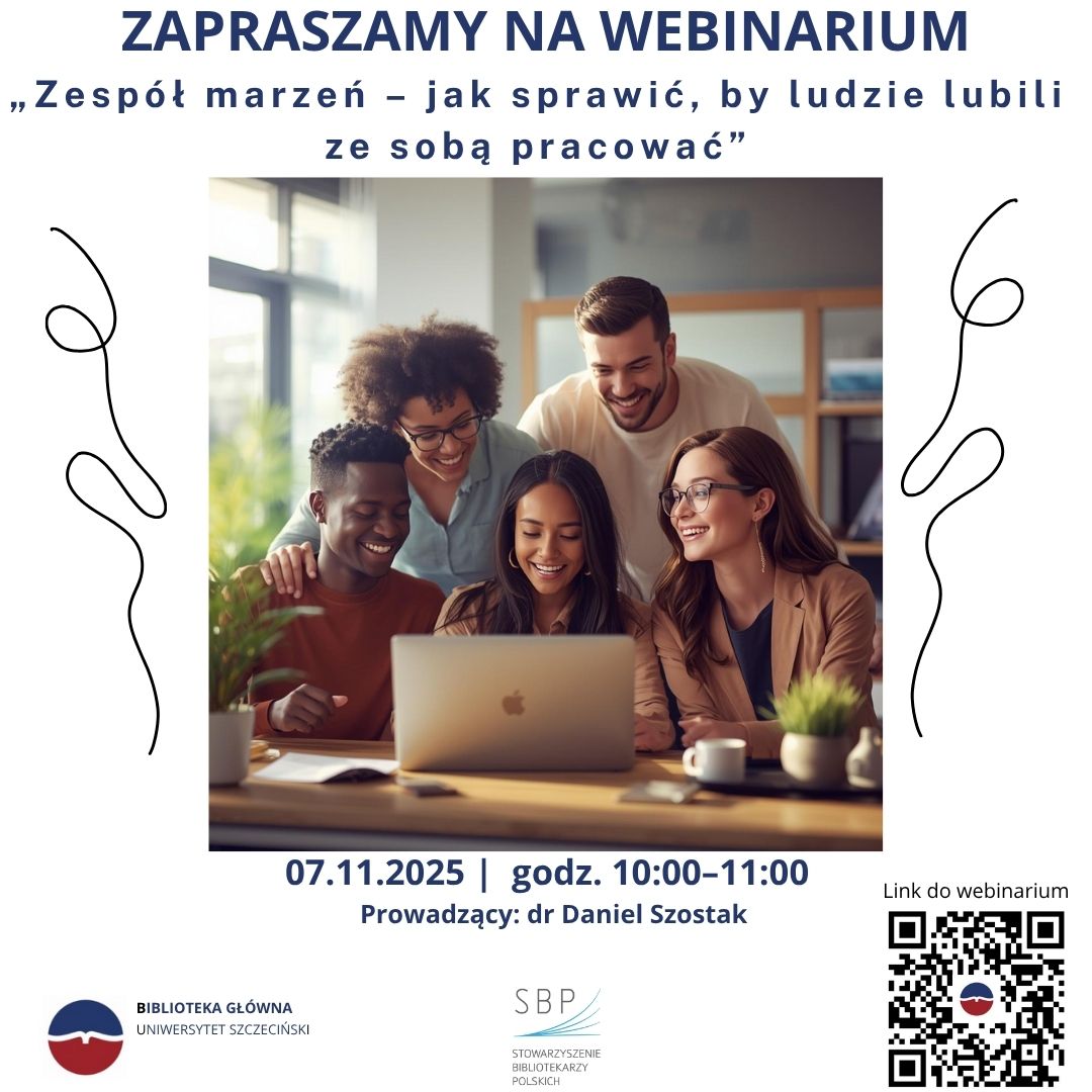 Biblioteka Główna Uniwersytetu Szczecińskiego oraz Sekcja Bibliotek Naukowych SBP zapraszają na webinar pt. „Zespół marzeń – jak sprawić, by ludzie lubili ze sobą pracować”. Spotkanie poprowadzi dr Daniel Szostak.